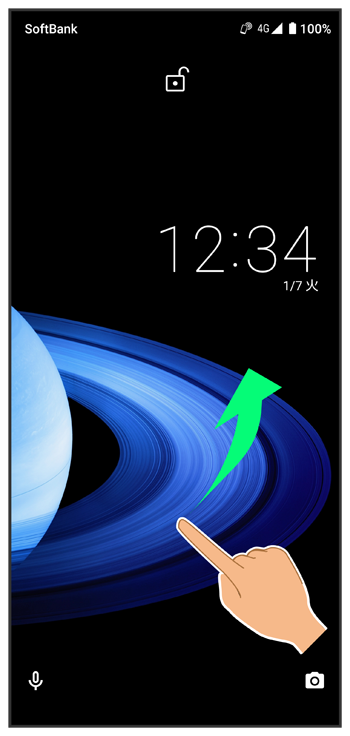 が表示されているときは、画面を上にフリックしたあとパターン/ロックNo.(PIN)/パスワードを入力してロックを解除する操作が必要です。