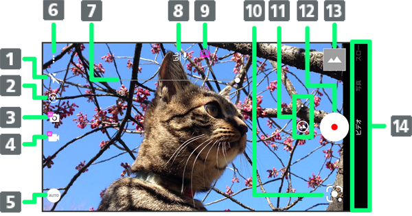 「フォト」の起動、または直前に撮った写真/動画が表示されます。 - 撮影モード