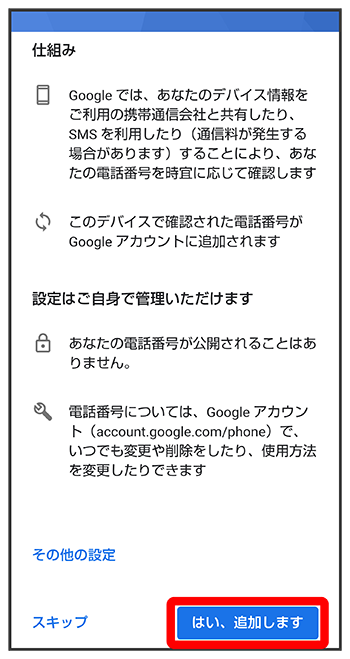 - 電話番号を追加しないときやセキュリティ保護目的でのみ電話番号を追加するときは、をタップします。以降は画面に従って操作してください。