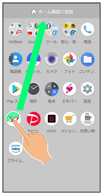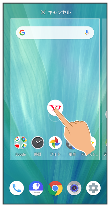 アプリ一覧画面でアプリをロングタッチし、「ホーム画面に追加」までドラッグ