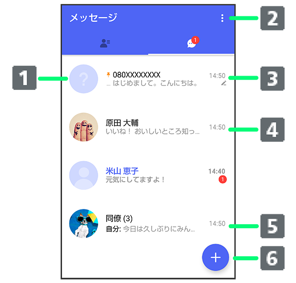 メッセージ一覧画面でメッセージをロングタッチ- メッセージの固定を解除するときは、メッセージ一覧画面でメッセージをロングタッチ