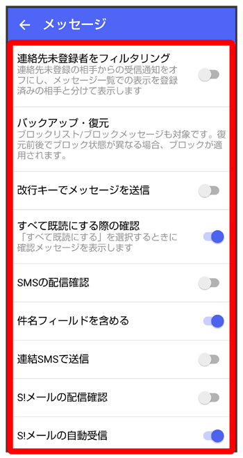 | 連絡先未登録者をフィルタリング | 連絡先に登録していない差出人からのメッセージを、連絡先に登録している差出人からのメッセージと分けて表示するかどうかを設定します。 ONにすると、連絡先に登録していない差出人からのメッセージは通知されなくなります。メッセージ一覧画面でをタップすると、連絡先に登録していない差出人からのメッセージを確認できます。 |