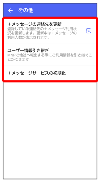 | +メッセージサービスの初期化 | 本体およびサーバー上にあるデータを削除できます。 |