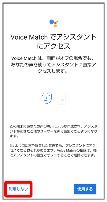 - Voice Matchを使うと、アシスタントキーを押す代わりに、画面点灯時に本機に「OK Google」と話しかけることで、音声操作が利用できます。Voice Matchを使いたい場合は、をタップしたあと、画面に従って操作してください。