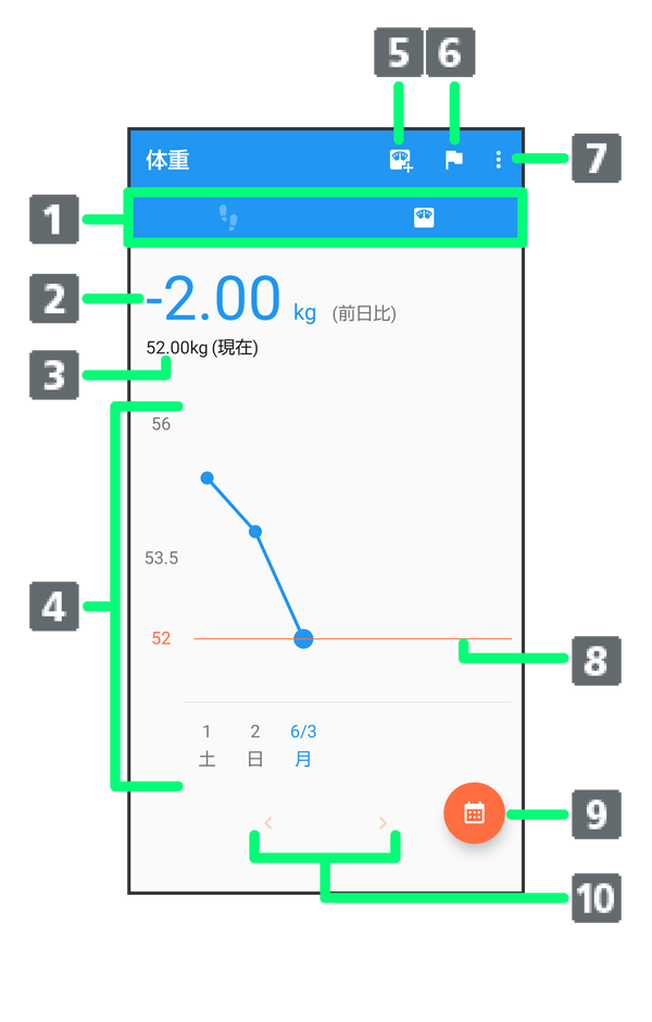 - 歩数タブ/体重タブ1