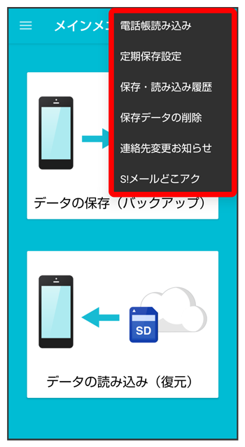 | S!メールどこアク1 | 本体の電話帳データを、「S!メール(MMS)どこでもアクセス」のサーバーにエクスポートします。 |