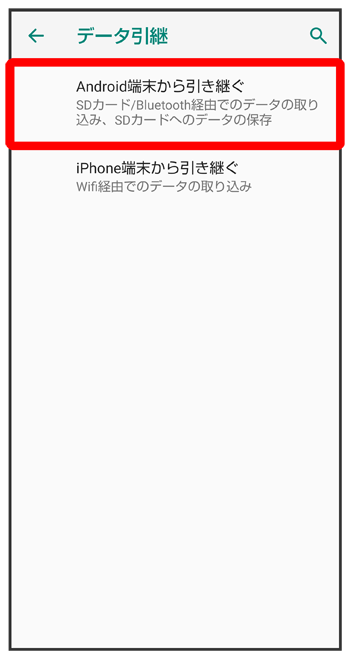- iPhone端末からデータを引き継ぐ場合は、をタップしてください。以降は画面に従って操作してください。