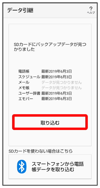 - SDカードが挿入されていないときや、SDカードにバックアップデータがないときは、取り込み元の携帯電話の選択画面が表示されます。画面に従って操作してください。