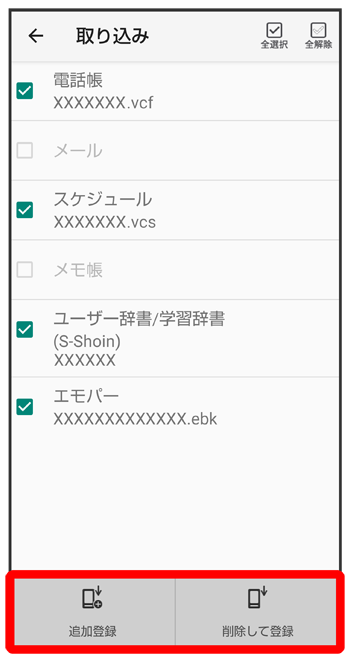 ユーザー辞書/学習辞書(S-Shoin)を取り込む場合、内部ストレージに保存されているユーザー辞書/学習辞書(S-Shoin)のデータが削除されますのでご注意ください。