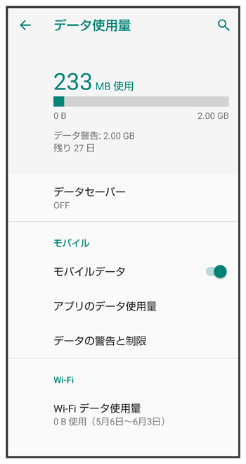 - 以降、使用中に上限に達したときは、モバイルデータ通信を無効にした案内が表示されます。このときは、画面に従って操作してください。