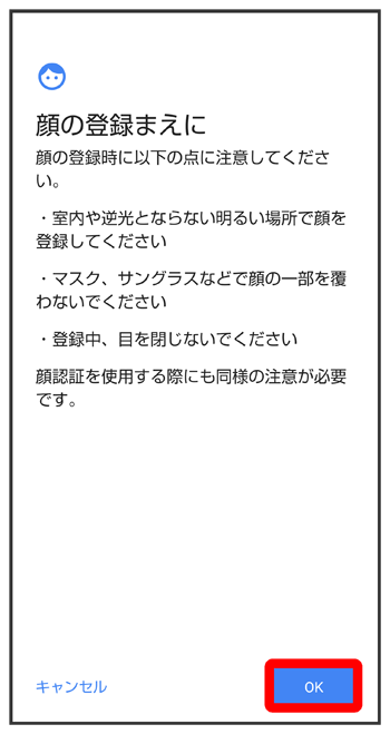 ホーム画面で顔データの登録後に顔認証の概要や注意事項を確認する