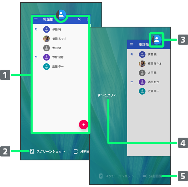 アプリの使用履歴画面でアプリの履歴のアイコンをタップ画面に従って操作- アプリ使用履歴画面で画面に従って操作しても、画面を分割できます。