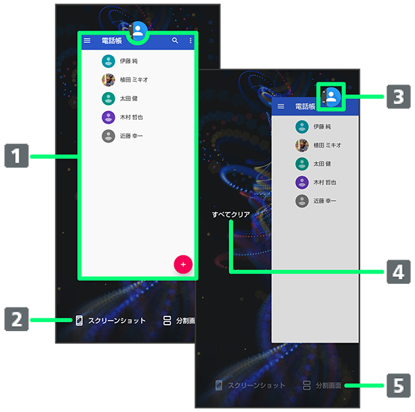 アプリの使用履歴画面でアプリの履歴のアイコンをタップ画面に従って操作- アプリ使用履歴画面で画面に従って操作しても、画面を分割できます。