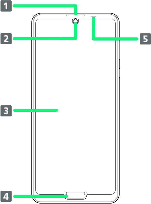 | 受話口/スピーカー | 通話相手の声、音楽や動画などの音声が聞こえます。 |