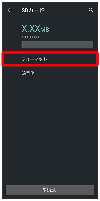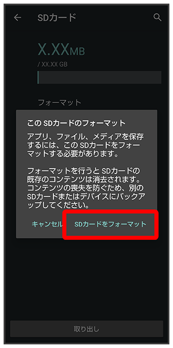 - フォーマットすると、SDカード内のデータがすべて消去されます。SDカードをフォーマットするときは、ご注意ください。
