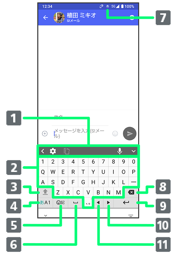 - 絵文字/記号/顔文字を入力(ロングタッチすると、入力拡張プラグインを表示。文字入力中は、カタカナ/英字変換3)