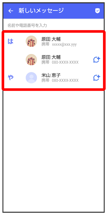 - 連絡先に登録していない電話番号/メールアドレスへ送信する場合は、「名前や電話番号を入力」欄に電話番号/メールアドレスを入力をタップしてメッセージを作成できます。