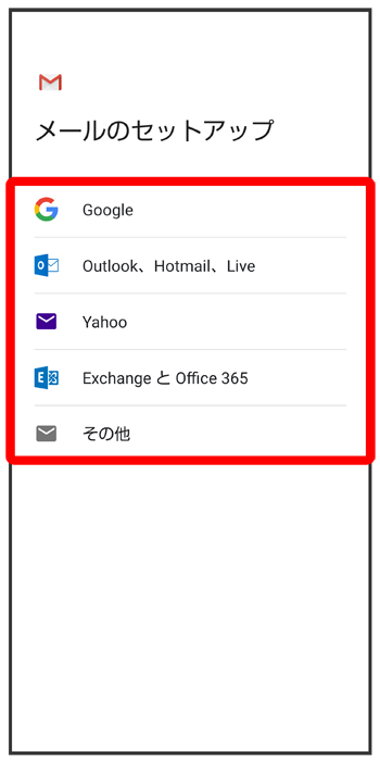- すでにGoogle アカウントでログインしている場合は、アカウント設定画面は表示されません。別のアカウントを追加するときは、「アカウントを追加する」を参照してください。