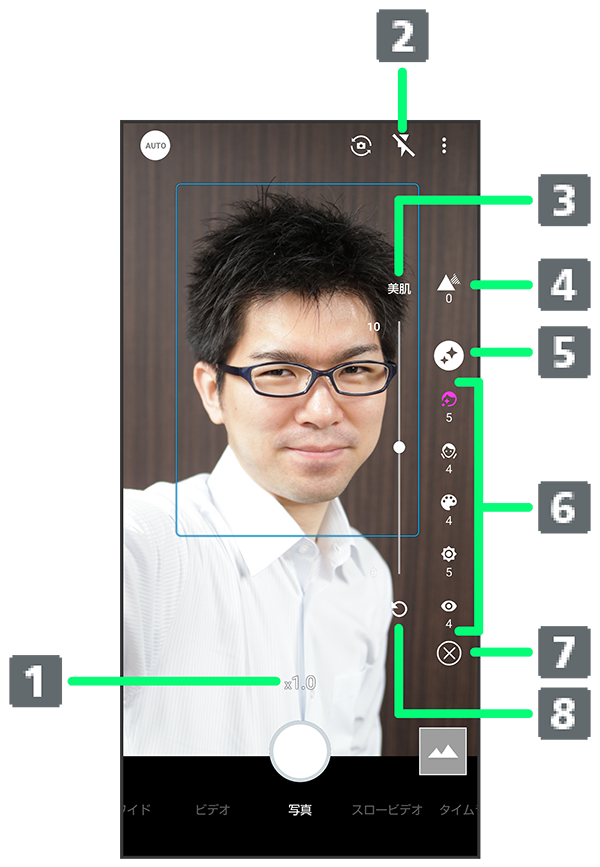 タップすると、調節バーが表示されます。調節バーを左右にドラッグして、ズーム倍率を調節1できます。 - セルフィーフラッシュ