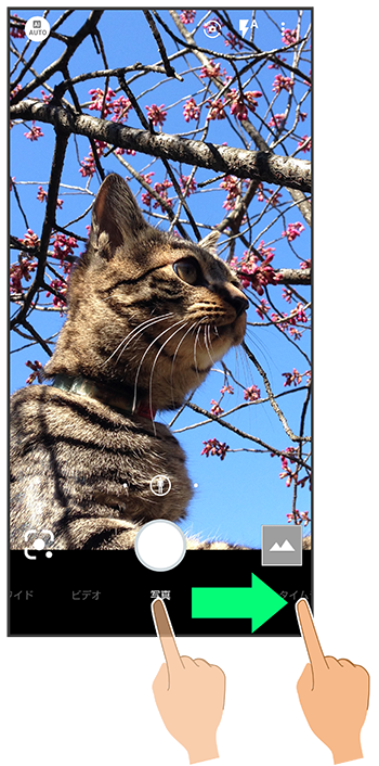 - 画面下部の撮影モードを左右にドラッグしてを選択すると、通常よりも動きが滑らかな動画を撮ることができます。詳しくは、「スロービデオモードで撮る」を参照してください。