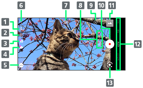 - 撮影シーンをに設定しているときは、標準カメラ/広角カメラのみの切り替えになります。