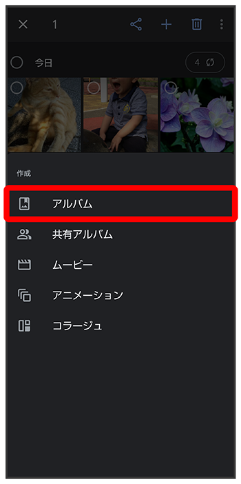 新規作成するアルバムの写真/動画をロングタッチ(