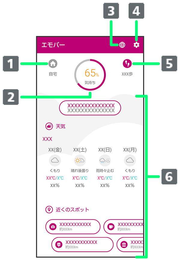 エモパー画面では、エモパーとあなたとのコミュニケーション度合いを確認したり、情報の登録や設定を行ったりすることができます。