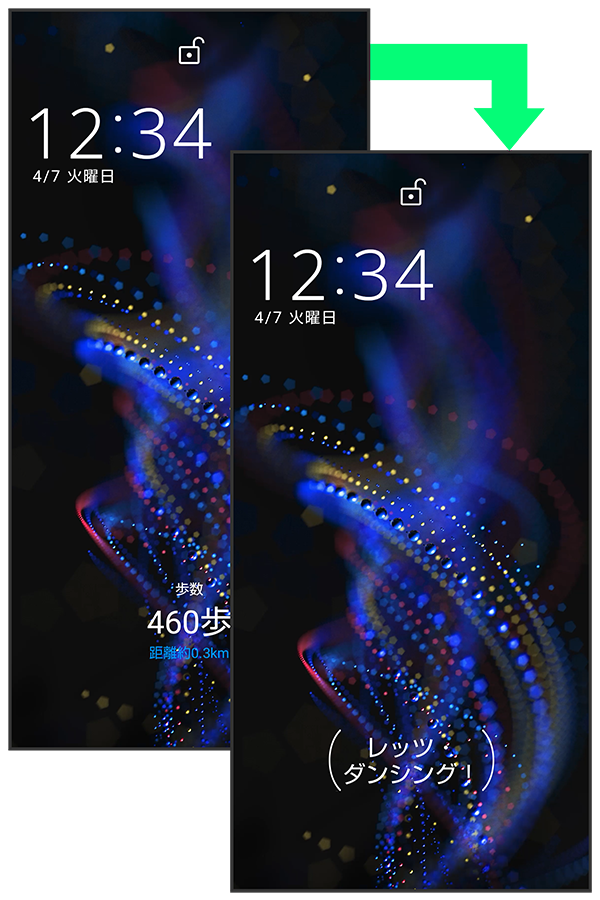 ロック画面では、エモパーがいろいろな情報をお知らせします。左右にフリックすると、情報を切り替えることができます。