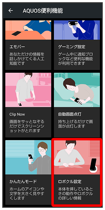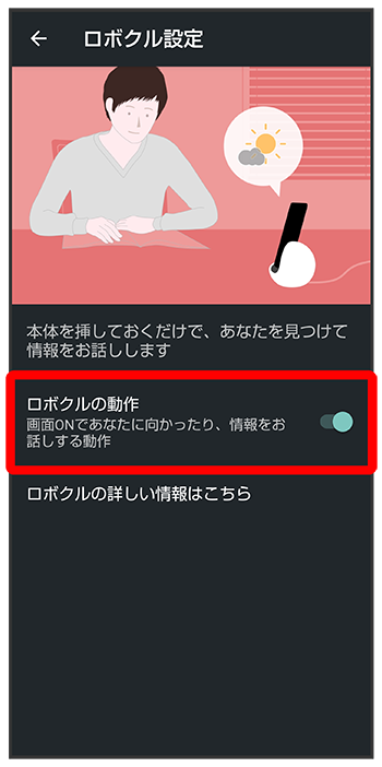 - 有効にすると、本機の電源が入っているとき、ロボクルで充電すると、ディスプレイ点灯時や充電開始、着信、アラームなどに連動してロボクルが回転します。