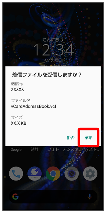 相手からデータの受信要求があると、ロック画面に通知が表示されます。次の操作を行うと、受信することができます。
