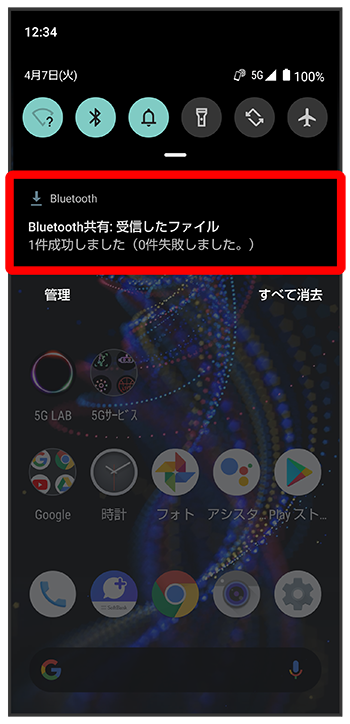 が表示されます。ステータスバーを下にドラッグしてBluetooth®共有通知をタップしてください。