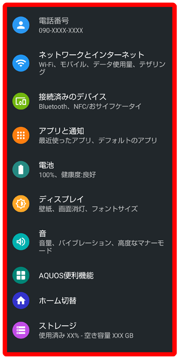| ネットワークとインターネット | Wi-Fiやモバイルネットワーク、テザリングなど、ネットワークやインターネットに関する設定ができます。 |