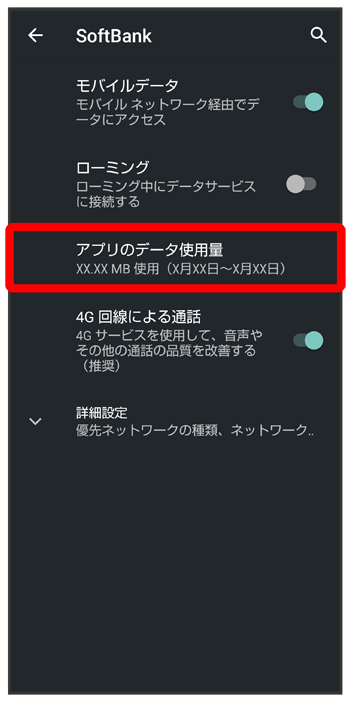 モバイルデータ使用量画面でアプリ名をタップ- をタップするたびに、有効(