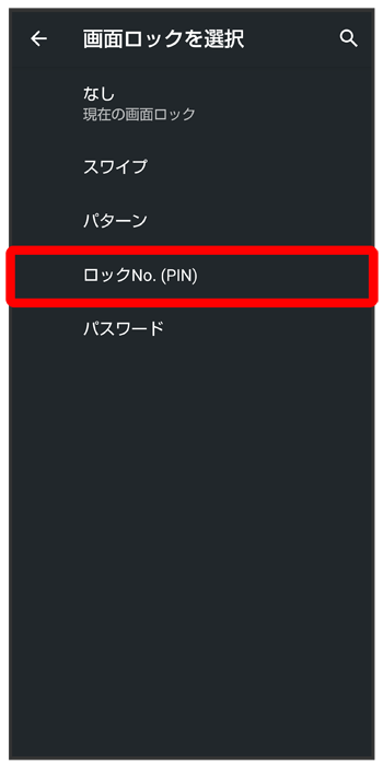 ロックNo.(PIN)で画面ロックを解除するように設定する