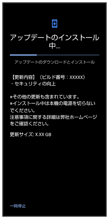 - システムアップデート中もほかの機能を使用できます。ただし、システムアップデートの通知後10日間は、システムアップデート中にほかの機能を使用していると、アップデートのインストールが一時的に停止されます。をタップすると、インストールが再開され、ほかの機能も使用可能になります。