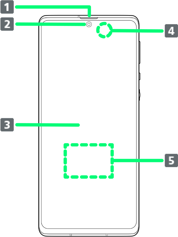 | 近接/明るさセンサー1 | 近接センサーは通話中にタッチパネルの誤動作を防ぎます。明るさセンサーは周囲の明るさに合わせて、ディスプレイの明るさを調節します。 |