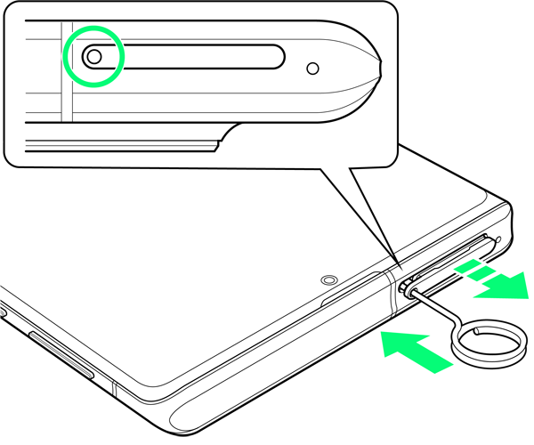 ディスプレイを上にして、カードトレイ取り出し用の穴に、SIM取り出しツールの先を差し込む