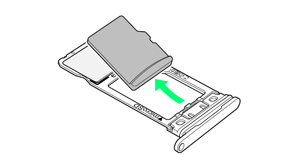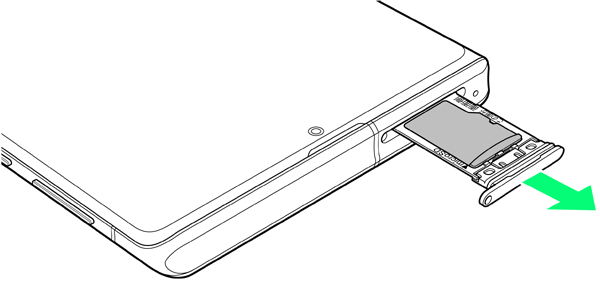 - ディスプレイを上にして、カードトレイを引き出してください。ディスプレイを下にしたり、本機を立てた状態でカードトレイを引き出すと、SIMカードやSDカードがカードトレイから外れ、紛失する可能性があります。
