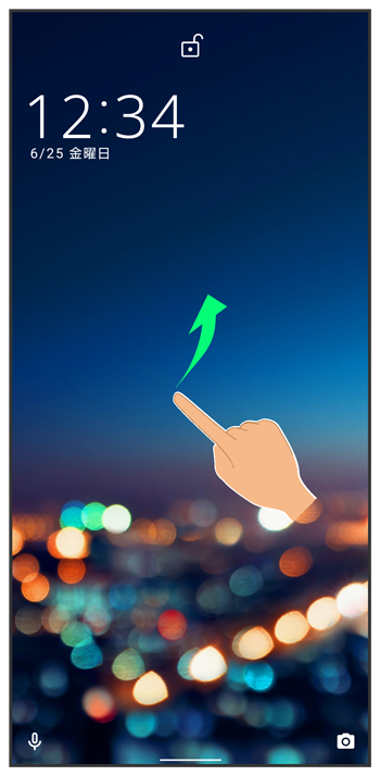 が表示されている場合に画面を上にフリックしたときは、このあとパターン/ロックNo.(PIN)/パスワードを入力してロックを解除する操作が必要です。