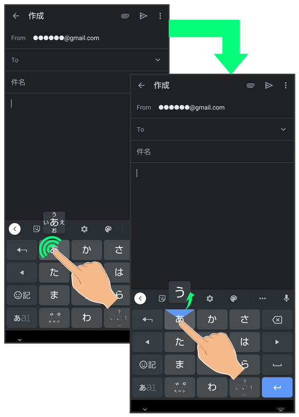 - キーをロングタッチすると、キー入力ガイドがポップアップで表示されます。キーをタップしたまま入力する文字の方向へフリックし、入力します。