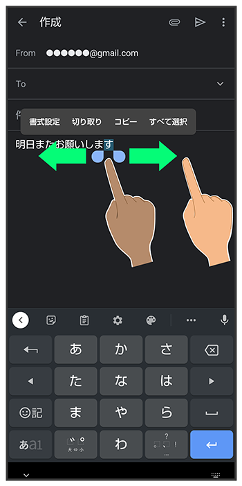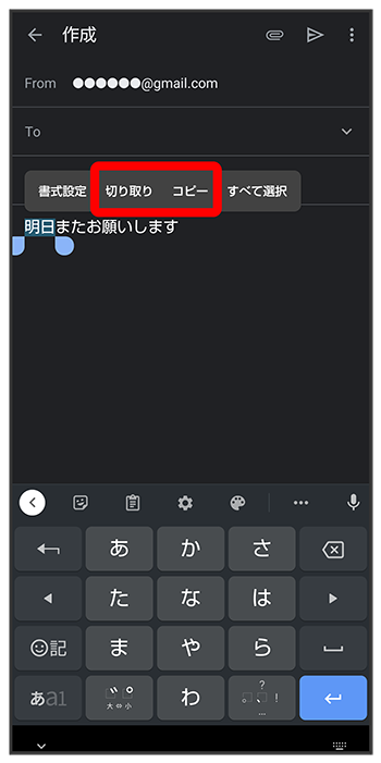 を左右にドラッグして、切り取り/コピーする文字を選択