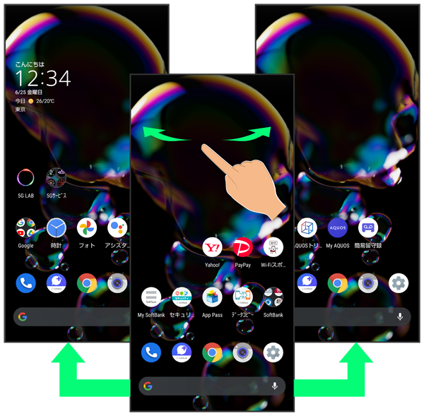 各シートを左右にフリックすると、ホーム画面シートを切り替えることができます。