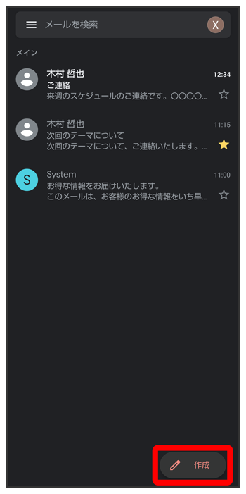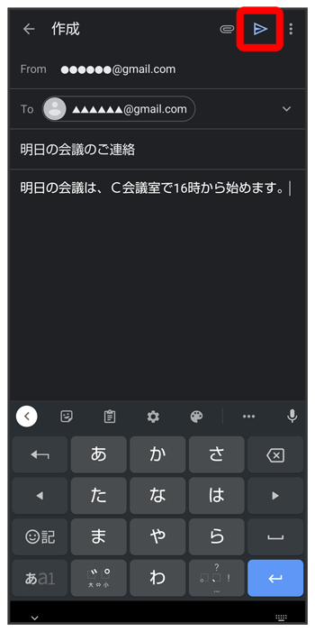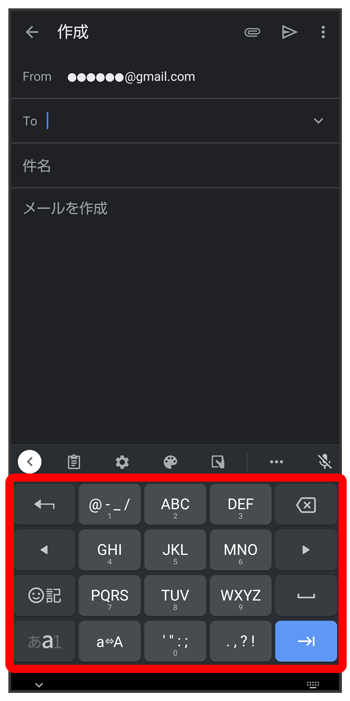 メール作成画面で- を選択すると、Google ドライブに保存したファイルを添付できます。