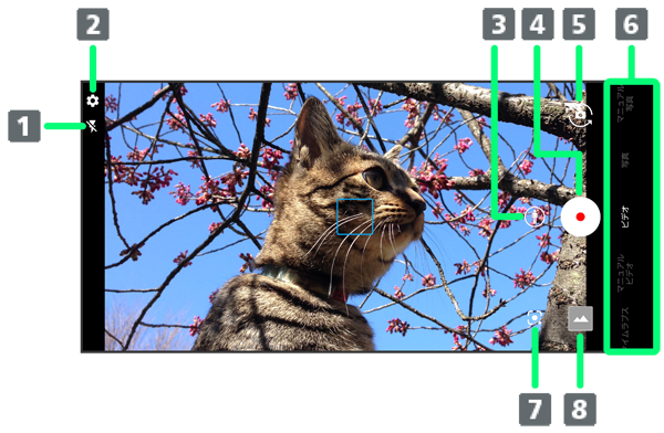撮影時の各種設定を行います。詳しくは、「動画撮影の設定をする」、「写真/動画撮影共通の設定をする」を参照してください。 - 画角切替1