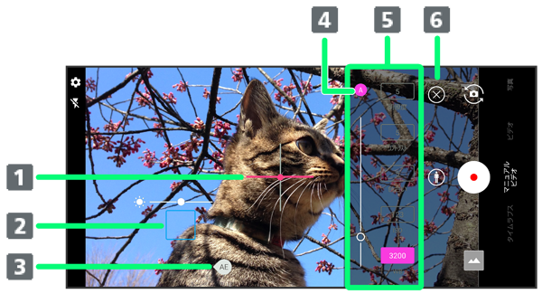 各設定の数値をタップすると、調節バーが表示され、設定を手動で調節することができます。 - 撮影設定表示エリアの表示(