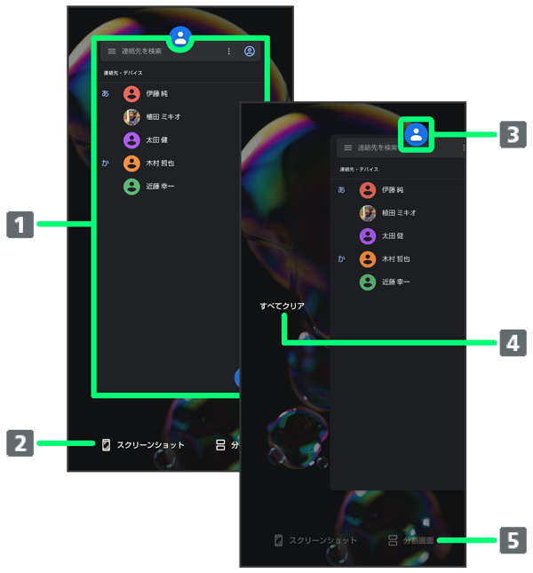 アプリの使用履歴画面で画面に従って操作- アプリの使用履歴画面でアプリの履歴のアイコンをタップと操作しても画面を分割できます。