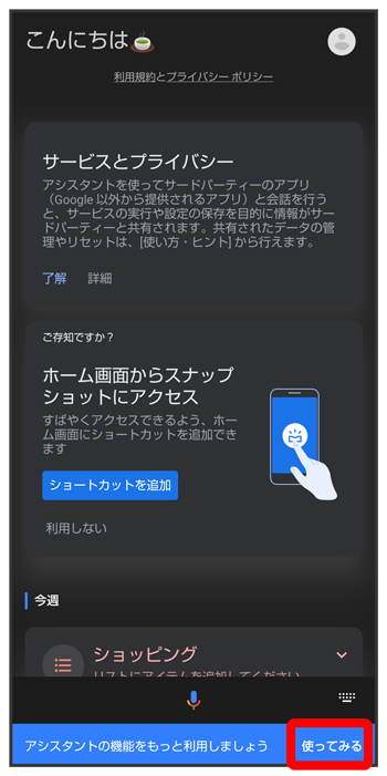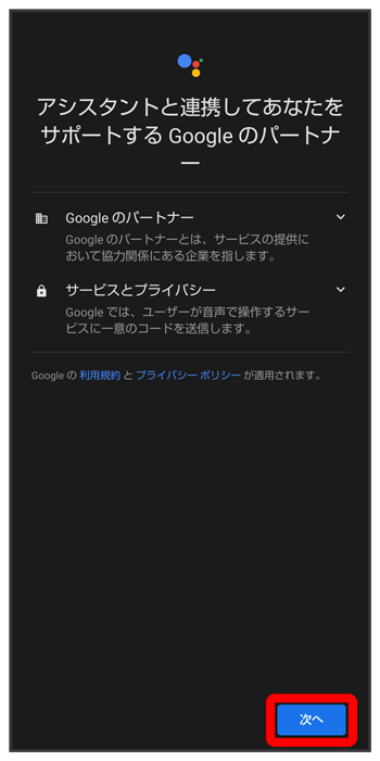 - Voice Matchを使うと、アシスタントキーを押す代わりに、画面点灯時に本機に「OK Google」と話しかけることで、音声操作が利用できます。Voice Matchを使いたい場合は、をタップしたあと、画面に従って操作してください。