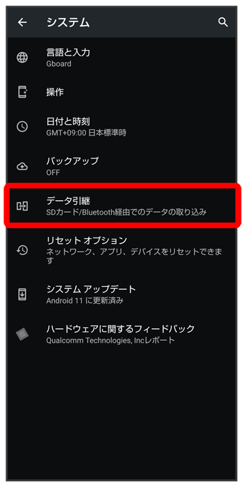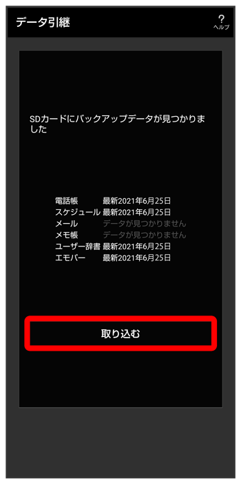 ほかの機器や本機でSDカードに保存したデータ(電話帳、スケジュール、ユーザー辞書/学習辞書(S-Shoin)、エモパー)を、本機に取り込むことができます。