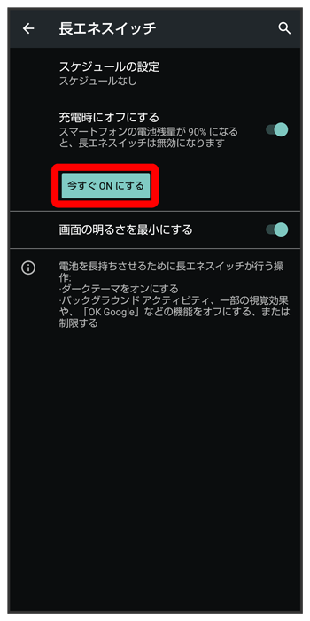 電池残量が90%になったときに長エネスイッチを自動的に無効にするかどうかを設定する
