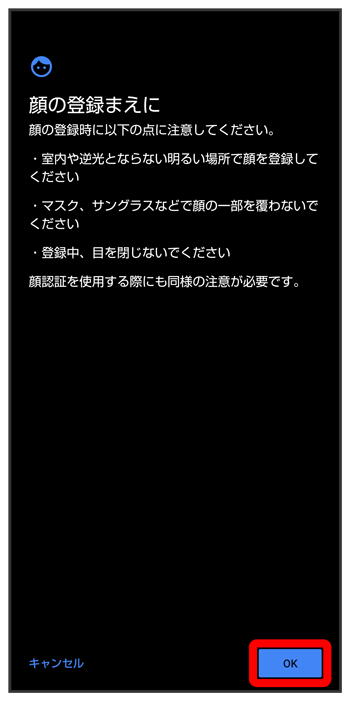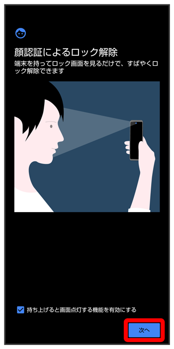 セキュリティ画面でパターン/ロックNo.(PIN)/パスワードを入力画面ロックを解除するタイミングをタップ顔データの登録後に顔認証の概要や注意事項を確認する